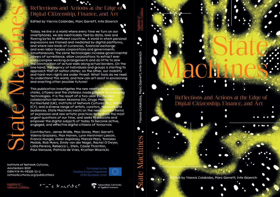 State Machines: Reflections and Actions at the Edge of Digital Citizenship, Finance, Art«This publication investigates the new relationships between states, citizens and the stateless made possible by emerging technologies. It is the result of a two-year EU-funded collaboration between Aksioma (SI), Drugo More (HR), Furtherfield (UK), Institute of Network Cultures (NL), NeMe (CY), and a diverse range of artists, curators, theorists and audiences»#books #network #arthttps://networkcultures.org/blog/publication/state-machines-reflections-and-actions-at-the-edge-of-digital-citizenship-finance-and-art/