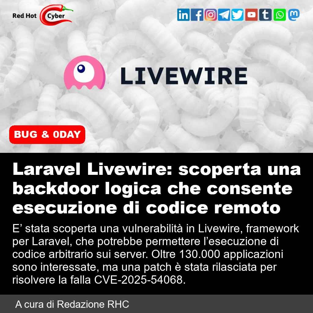 Laravel Livewire: scoperta una backdoor logica che consente esecuzione di codice remoto📌 Link all'articolo : https://www.redhotcyber.com/post/laravel-livewire-scoperta-una-backdoor-logica-che-consente-esecuzione-di-codice-remoto/#redhotcyber #news #cybersecurity #hacking #laravel #livewire #vulnerabilita #sicurezzainformatica