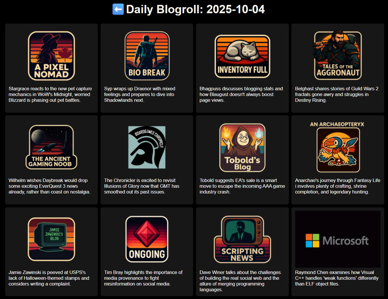 If it's Saturday, it must be the #DailyBlogroll. Stories by @stargrace, Syp, Bhagpuss, @belghast, @tagn.wordpress.com, Boardgame Chronicler, Tobold, @anarchaeopteryx, Jamie Zawinski, Tim Bray, @davew (I *am* using anchor tags), and Ray Chen. Just one day late on all the best gaming and tech blogs.https://chasingdings.com/dailyblogroll/blogrolls/daily-blogroll-2025-10-04.html