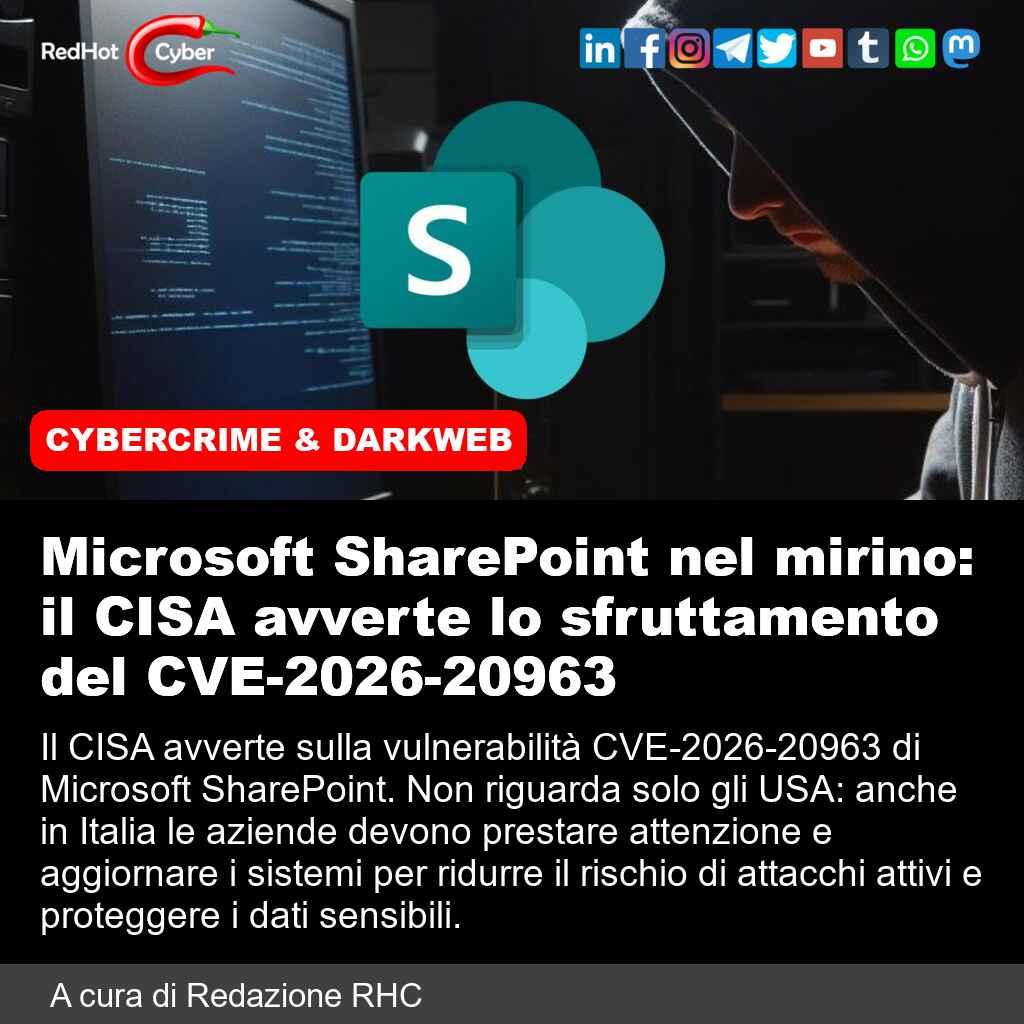 📌 Link all'articolo : https://www.redhotcyber.com/post/microsoft-sharepoint-nel-mirino-il-cisa-avverte-lo-sfruttamento-del-cve-2026-20963/