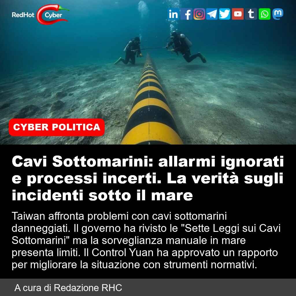 #redhotcyber #news #taiwan #cavisottomarini #sicurezzamarittima #sorveglianzamarina #leggisottomarine #controlyuan #normativasicurezza