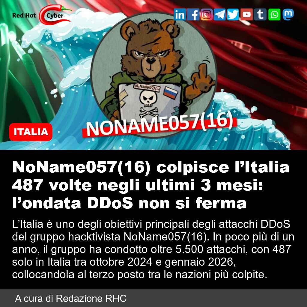 NoName057(16) colpisce l’Italia 487 volte negli ultimi 3 mesi: l’ondata DDoS non si ferma