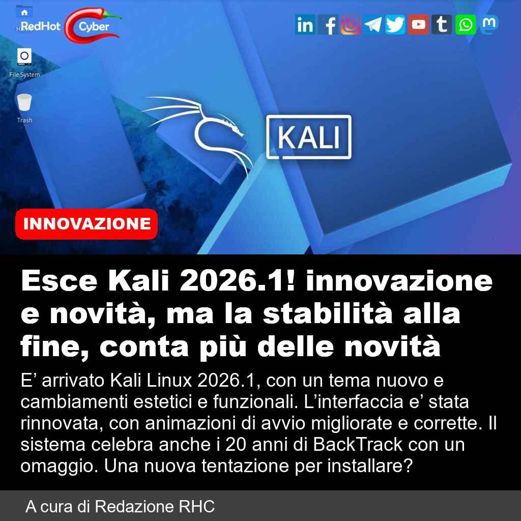 Esce Kali 2026.1! innovazione e novità, ma la stabilità alla fine, conta più delle novità📌 Link all'articolo : https://www.redhotcyber.com/post/esce-kali-2026-1-innovazione-e-novita-ma-la-stabilita-alla-fine-conta-piu-delle-novita/#redhotcyber #news #kaliLinux #cybersecurity #hacking #linux #nuovaversione #kalilinux20261 #backtrack