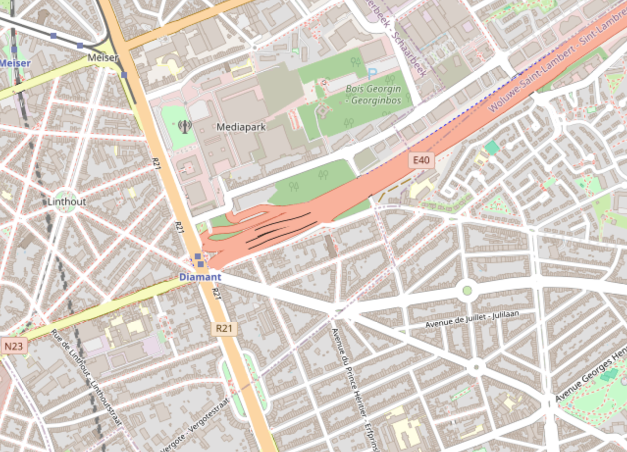 I'm still obsessed with the idea of finding a #map designed for humans instead of cars.Take these screenshots from Brussels: in the default #openstreetmap view, the highway is big and red.If you remove it, as I tried with MapTiler, the area is simply grey: not for humans, not for bikes, so there is no need for it to be clearly visible. The result has less clutter and it's more pleasant.Are there any map services designed for humans, where car infrastructure is simply hidden?
