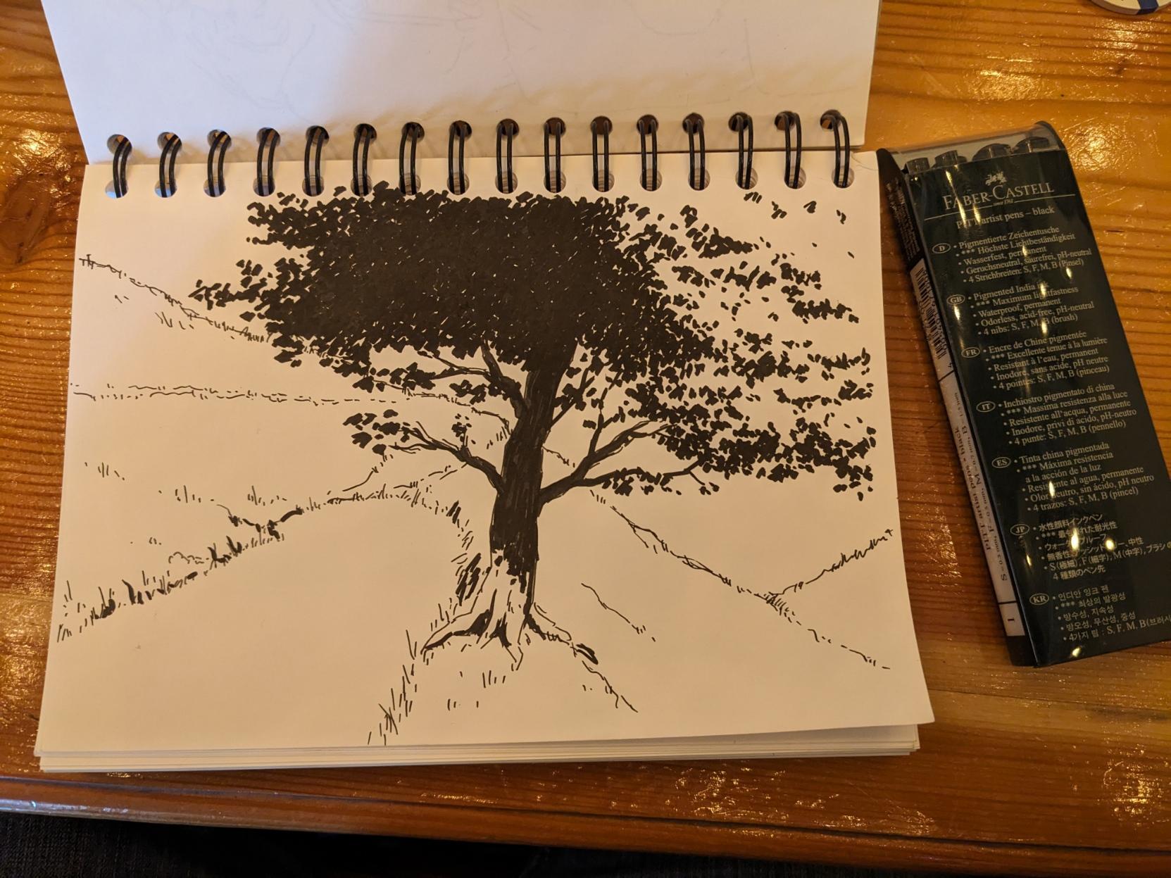 Rebelote hier soir.En panne d'inspiration, je suis parti d'une forme aléatoire qu'on remplit ensuite pour en faire une maison (une idée que j'ai vu je ne sais plus où online).Plutôt content du résultat, j'ai voulu reproduire l'expérience pour le 2e dessin, mais je ne savais vraiment pas où j'allais, donc au final on a un gros poisson-insecte-ile-vaisseau-village. ^^'Et un arbre pour le 3e, parce que c'est relaxant (mais les feuillages ça reste intimidant).#Genève #drinkAndDraw #mastoart