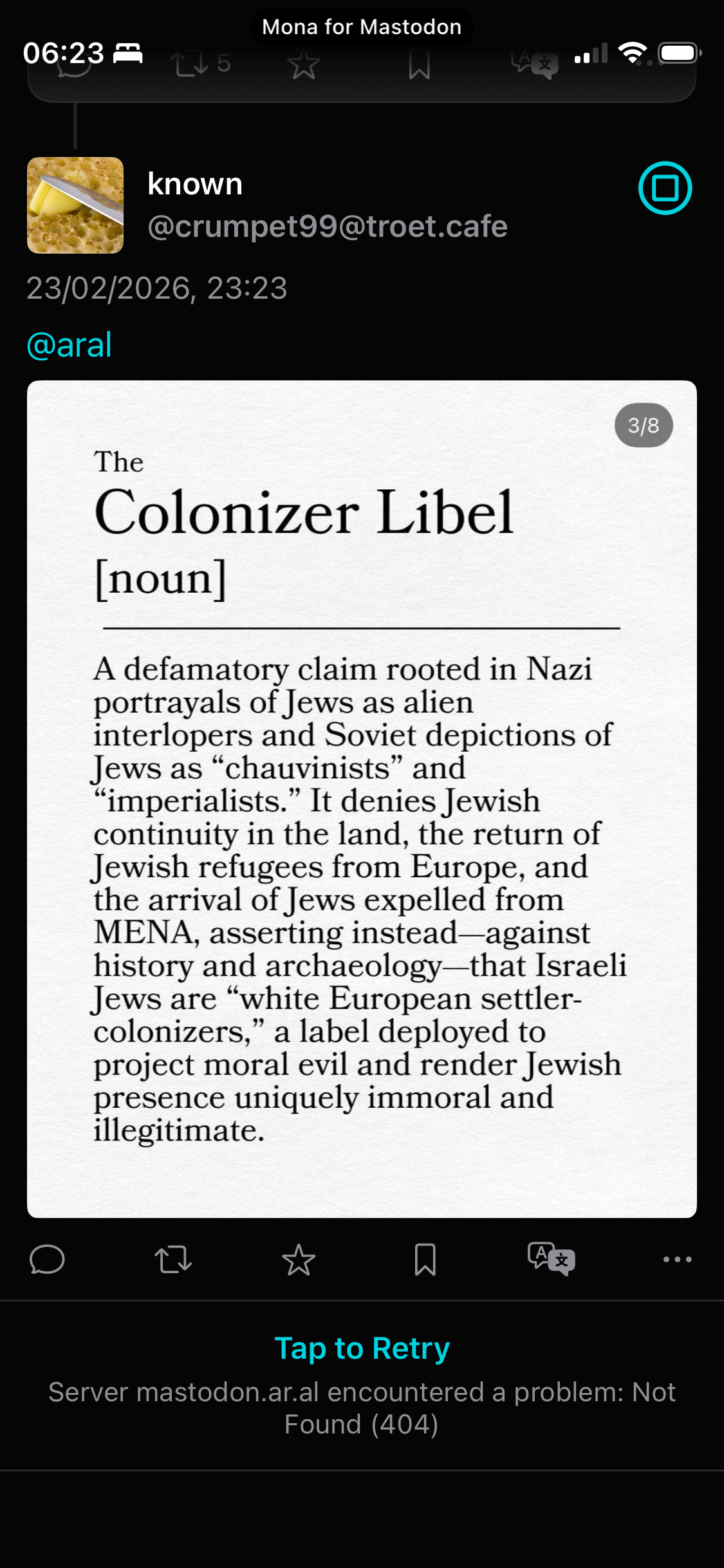 @edendestroyer It was bullshit then and itās bullshit now. Zionism is ā and has always been ā a colonial, genocidal, and, furthermore, an antisemitic project.https://en.wikipedia.org/wiki/Zionism_as_settler_colonialismhttps://en.wikipedia.org/wiki/Zionist_antisemitism