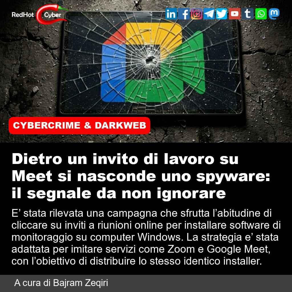 Dietro un invito di lavoro su Meet si nasconde uno spyware: il segnale da non ignorare📌 Link all'articolo : https://www.redhotcyber.com/post/dietro-un-invito-di-lavoro-su-meet-si-nasconde-uno-spyware-il-segnale-da-non-ignorare/#redhotcyber #news #sicurezzainformatica #hacking #malware #cybersecurity #phishing #windows #zoom