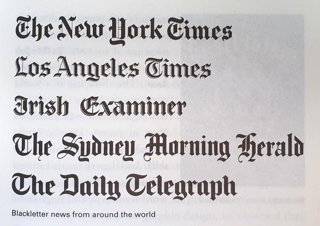 A nice array of newspaper mastheads in blackletter type (Simon Garfield, "Just My Type")