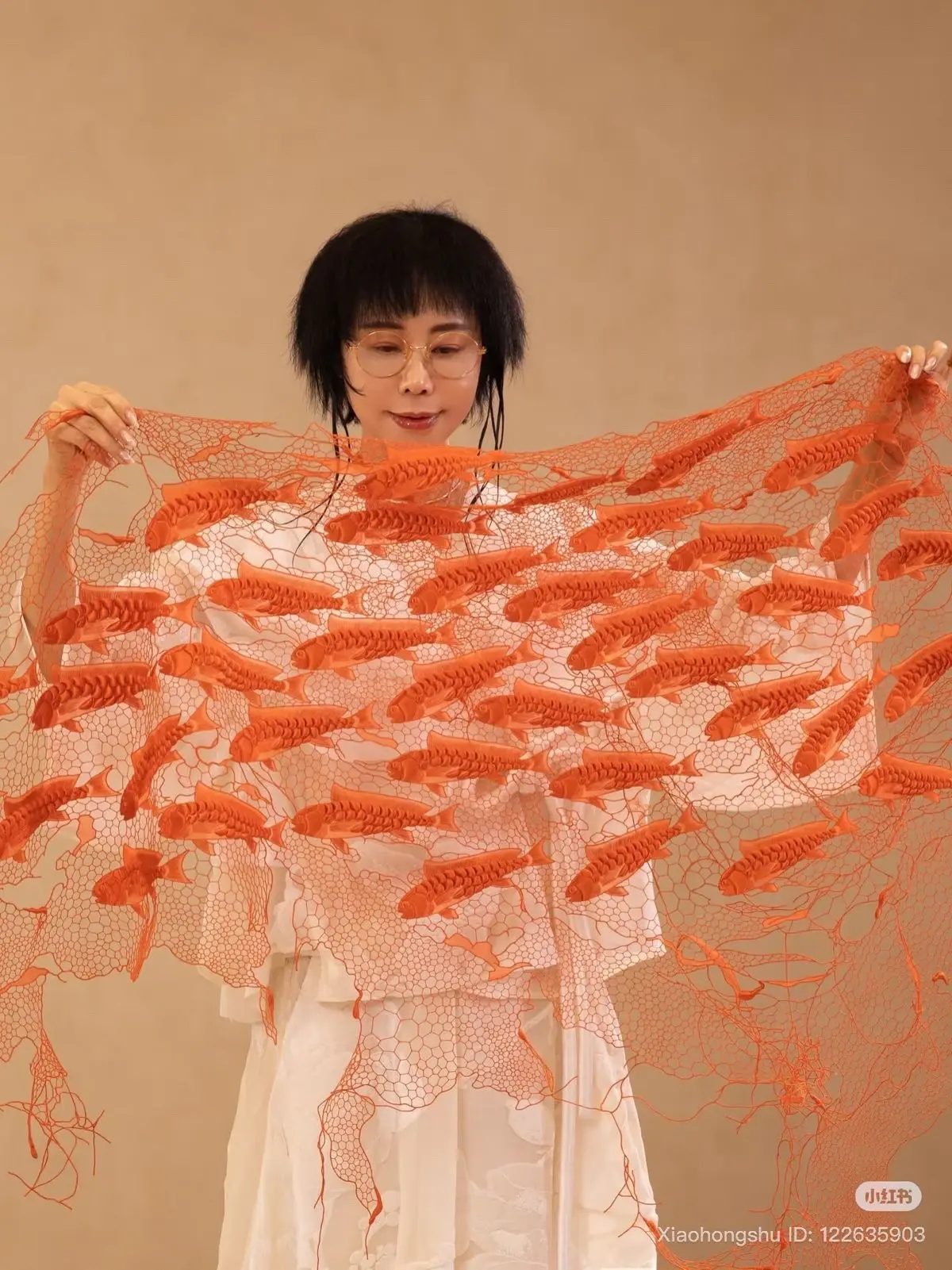 Textile art featuring a school of orange croaker fish, by artist Lin Xia.This is piece of Taizhou embroidery, a traditional Chinese textile art form from Zhejiang province. #WomensArt #Art 🇨🇳