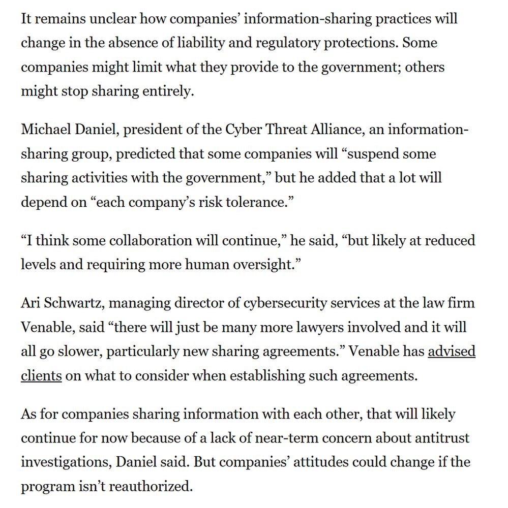 Eric Geller (@ericjgeller.com)https://bsky.app/profile/ericjgeller.com/post/3m253wibrde2h> The Cybersecurity Information Sharing Act expired at midnight after Congress failed to reauthorize it.
