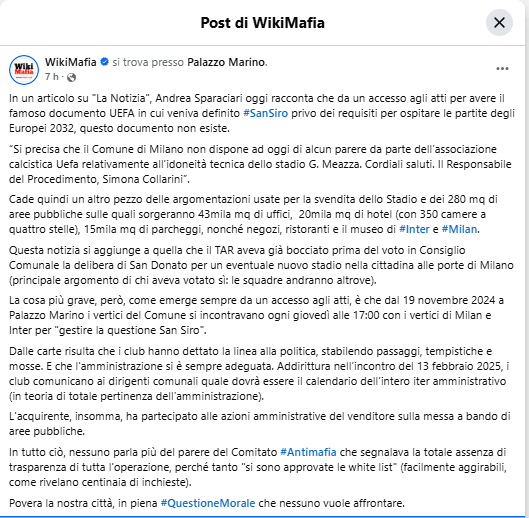 Il "centrosinistra" di Milano si rivela un comitato d'affari al servizio di archistar, palazzinari e club di calcio, contro ogni idea di tutela dei beni comuni.Hanno recitato la loro parte nel teatrino delle società sportive che minacciavano di andare via da Milano, mettendo in scena la bufala della perdita di idoneità dello stadio attuale per una svendita pilotata dall'acquirente. Il letame dei compagni finti farà germogliare fascisti veri alle prossime amministrative.