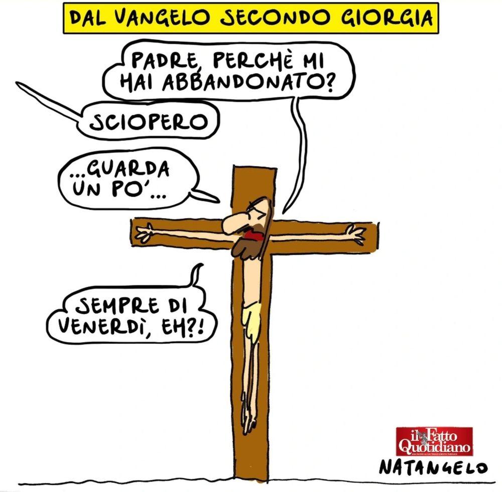 natangelo (@natangelo.bsky.social)https://bsky.app/profile/natangelo.bsky.social/post/3m542zg3f222y> Venerdì santissimo - la mia vignetta per la prima pagina de Il Fatto Quotidiano oggi in edicola #12dicembre #sciopero #meloni #cgil #vignetta #fumetto #satira #ilfattoquotidiano #natangelo