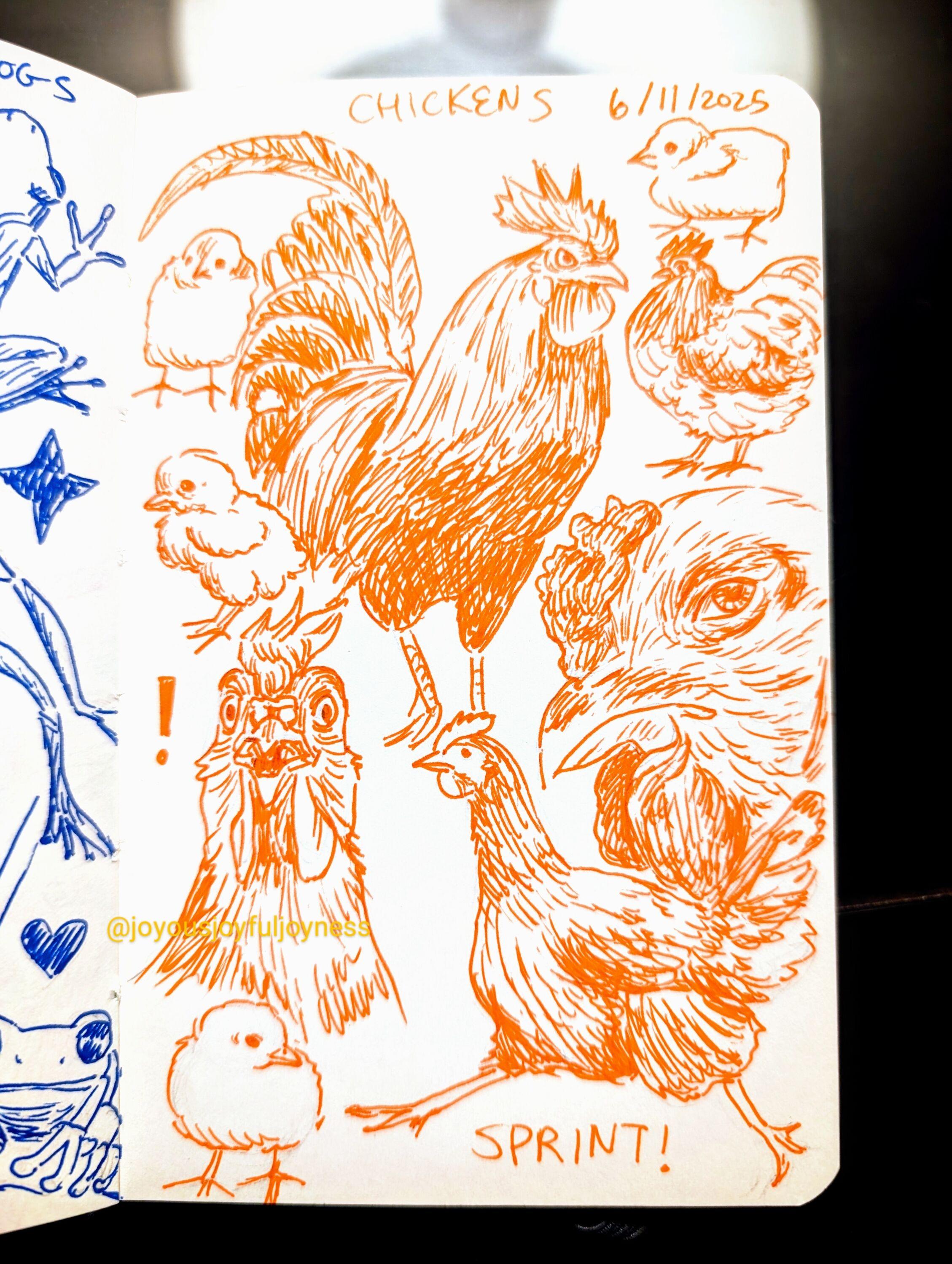 Detox Doodles!This is my daily sketching habit in an effort to curb mindless scrolling.This page is about chickens, and my favorite is the sprinting chicken!#art #bird #chicken #sketch #DetoxDoodles #sciart #InkArt