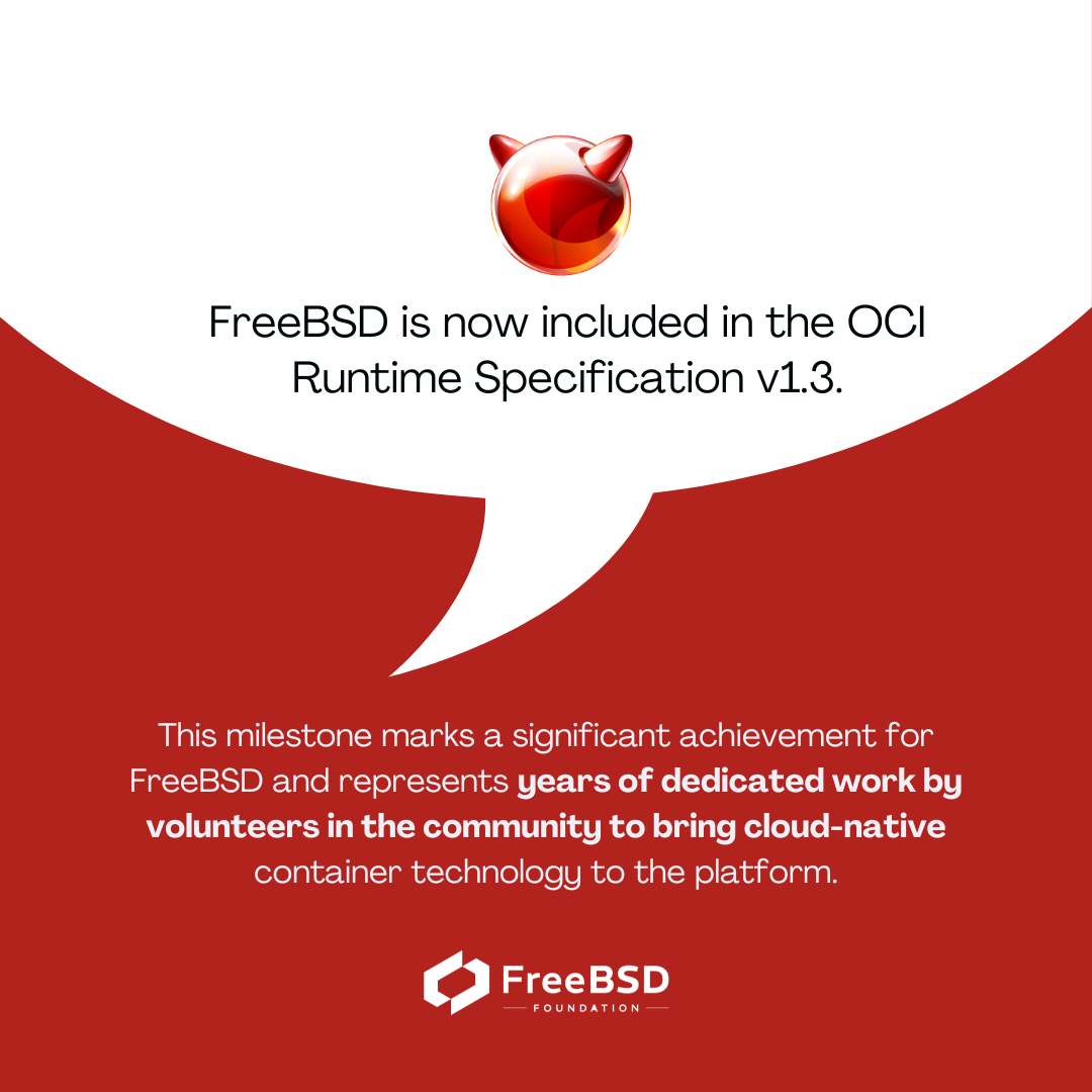 FreeBSD is now included in the OCI Runtime Specification v1.3.This update provides clearer guidance for running OCI-compliant workloads on FreeBSD and supports ongoing community efforts to improve interoperability with cloud-native tooling.For developers and organizations using FreeBSD, this work helps make container workflows more accessible and better aligned with existing ecosystem documentation and practices.Read the announcement: https://freebsdfoundation.org/blog/freebsd-officially-supported-in-oci-runtime-specification-v1-3/