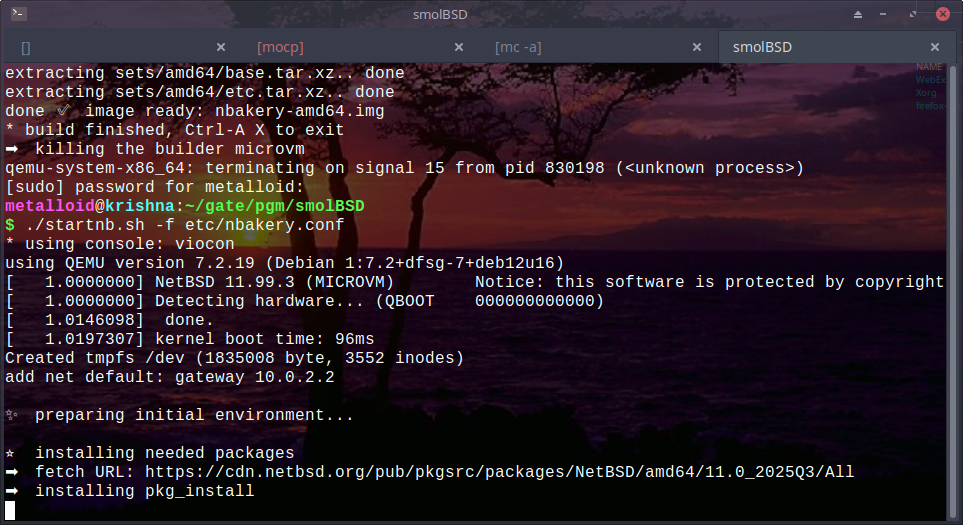 The mighty world of BSDPlaying with again smolBSD, a fantastic metaOS system that I talked about a few weeks ago.I'm a newbie, a greenhorn, when it comes to meta-operating systems built on top of NetBSD.I am very eager to learn by doing, making mistakes in the process, correcting and feel the warmth of the BSD community, who is happy to correct, esp when I show that I read the docs after making the mistakesThe journey is fantastic, the learning process is fun. microVM's are amazing. I've registered 11ms boot times on this small machine with a few CPU cores (and 40GB RAM). The fun is endless#programming #technology #BSD #netBSD #metaOS #microVM #networking #qemu #host #bmake #curl #sshd #Linux https://smolbsd.org/
