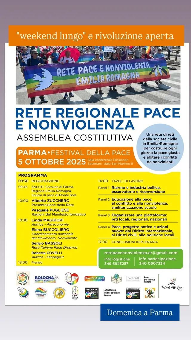 Domenica 5 ottobre 2025 a Parma assemblea costitutiva della Rete Regionale Pace e Nonviolenza.