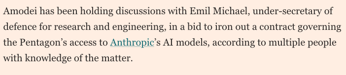 Anthropic chief back in talks with Pentagon about AI deal https://www.ft.com/content/97bda2ef-fc06-40b3-a867-f61a711b148b