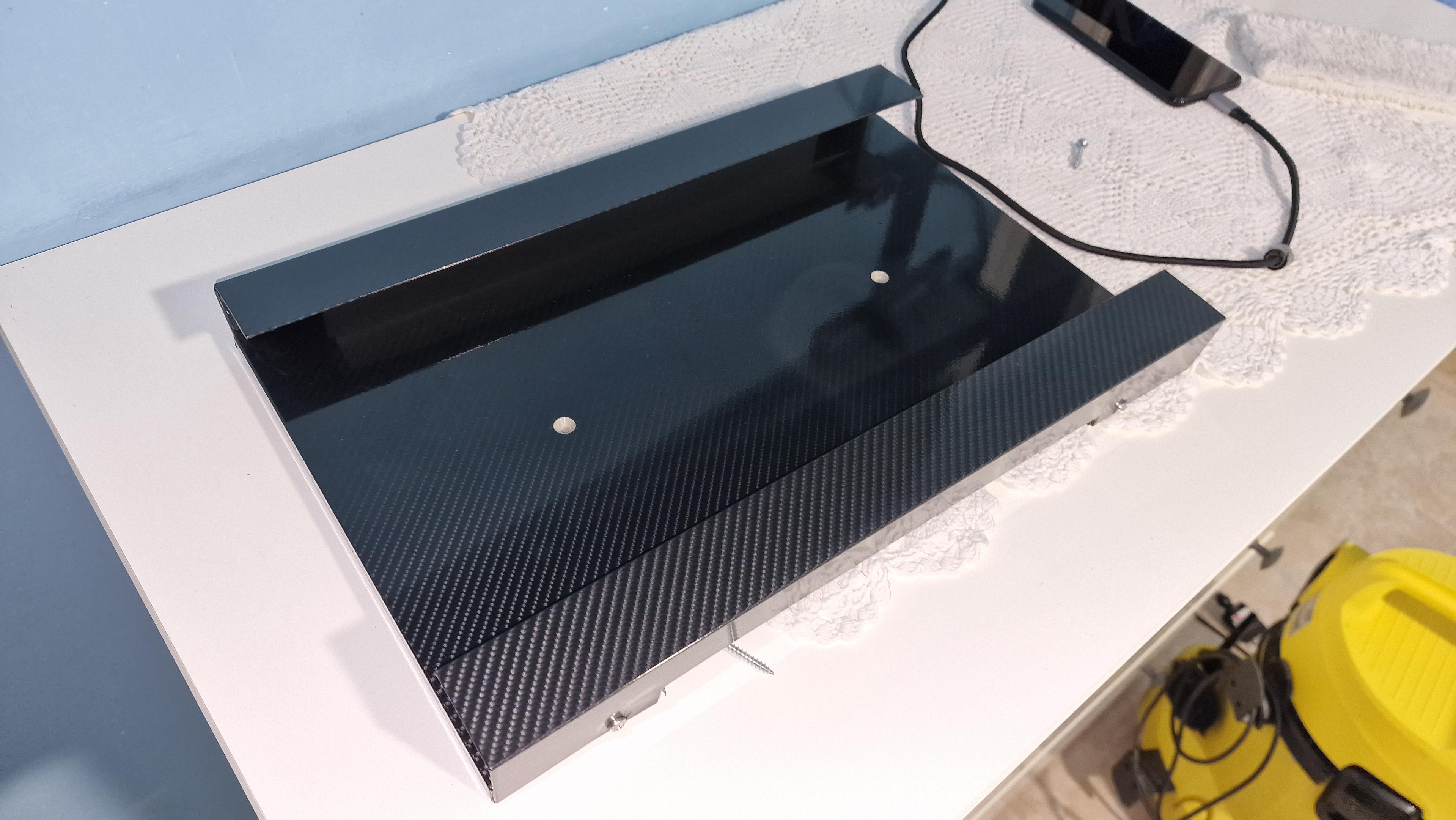 Quello bianco è un pannello in PVC di recupero dalla galvanica, lo buttavano via, poi c'è un profilo ad angolo in alluminio e pellicola lucida effetto carbonio del negozio di cinesi.