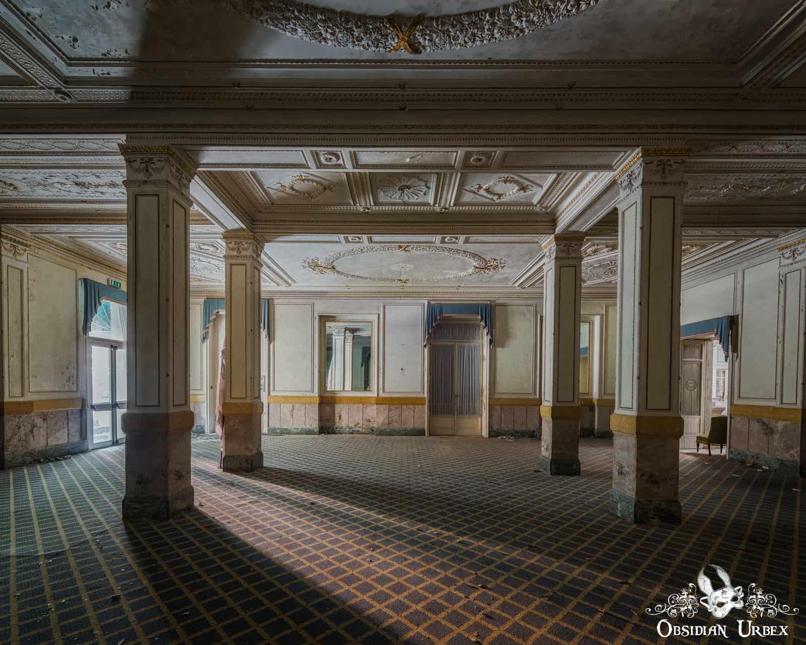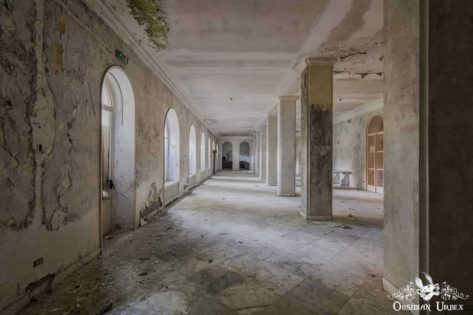 The hotel’s crown jewel remains its breathtaking ballroom. White ceiling drapes hang below the skylight, diffusing the harsh Italian sunlight into a soft glow. Perfect for photography!#Italy #Abandoned #Photography #Ballroom #Light #Architecture #LostPlaces #Travel #Hotel