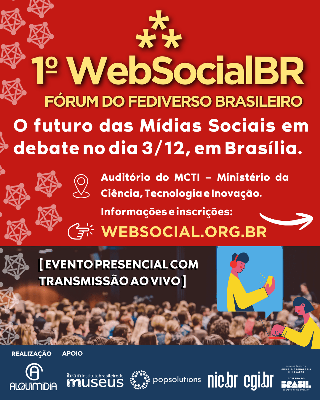 O 1º WebSocialBR reunirá administradores de comunidades, gestores, parlamentares, pesquisadores e comunicadores para trocarem experiências no intuito de fortalecer as redes federadas no Brasil. O encontro será realizado no auditório do MCTI — Ministério da Ciência, Tecnologia e Inovação.