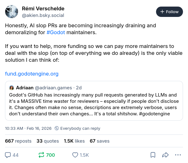 At this point, open-source development itself is being DDoS'ed by LLMs and their human users.