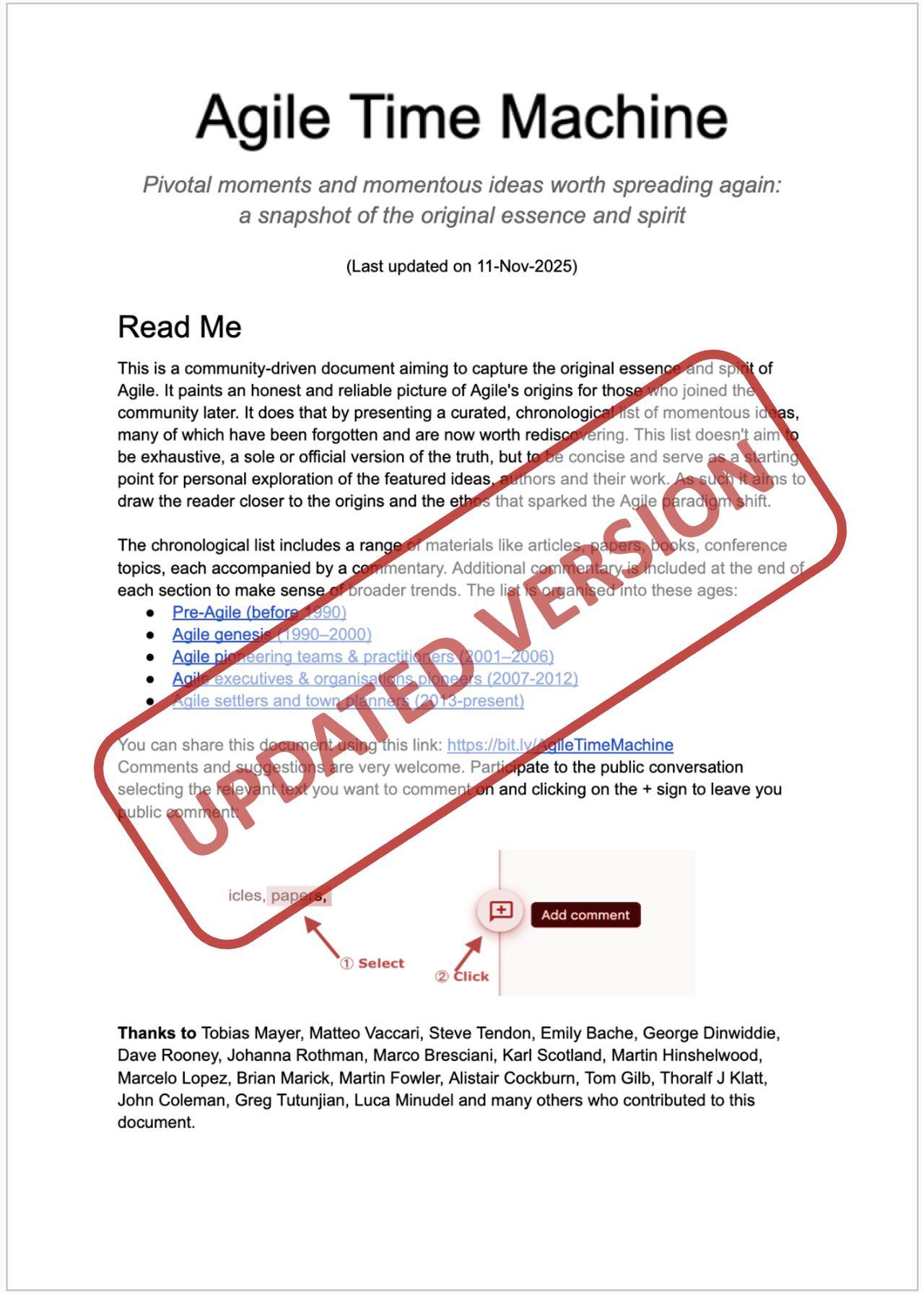 - Thanks - to all those that provided info/content/edits etc (their contributions do not imply endorsement of this evolving doc): Tobias Mayer, @xpmatteo, @tendon, @emilybache @gdinwiddie, @daverooneyca @johannarothman, @AAMfP @kjscotland, @MrHinsh, Marcelo Lopez, @marick, @mfowler, Alistair Cockburn, @tom Gilb, Thoralf J Klatt, John Coleman, Greg Tutunjian and many others who contributed