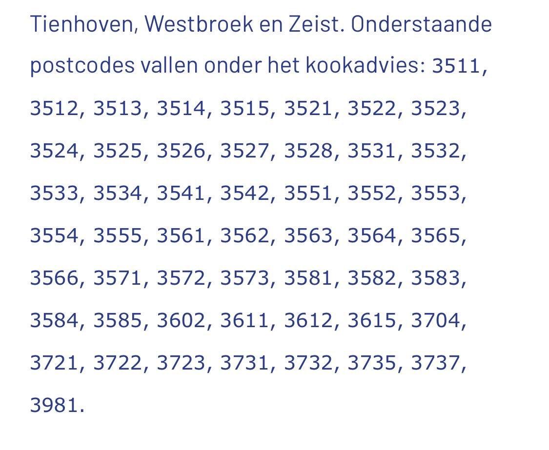 NL Utrecht folks! Certain postal code areas have a water advisory to boil tap water for 3 mins before consumption (even for preparing food or brushing teeth) due to a bacteria found in the water supply:https://nos.nl/l/2588735See screenshot for affected postal code areas; please share onwards for who needs to know!
