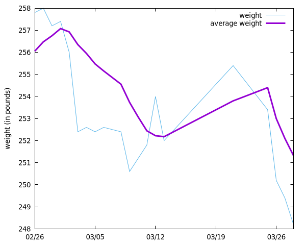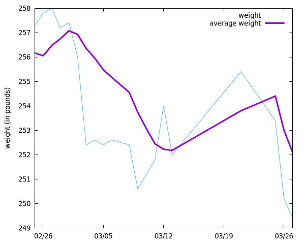 OMG I did it ;_;I'm under 250 https://dustycloud.org/tmp/org_diet_results.html249.4! I haven't been under 250 since November 2016... nearly a decade ago!When I hit 247 I will officially be at my lowest in a decade :O