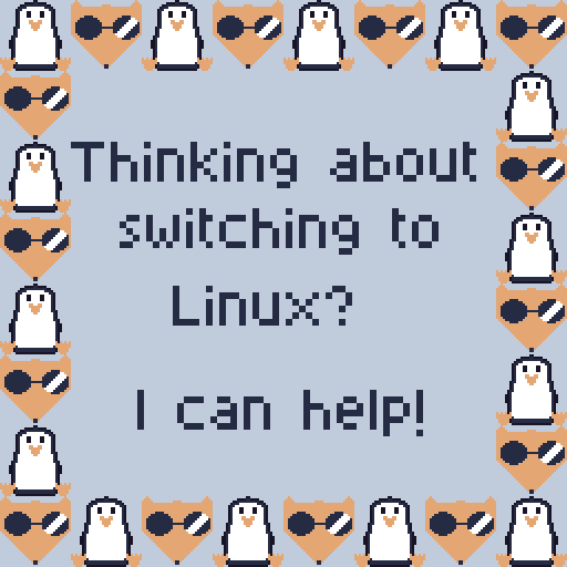 Quick picture I made in aseprite to post on my various socials.It's windows 10 end of life day. I cannot recommend you stay on windows 10 if your computer is connected to the internet, but I also don't like windows 11 and know many feel similarly.So, to that end, if you want to switch to Linux but don't know how to start, consider this my free offer to give you suggestions and help you get started.