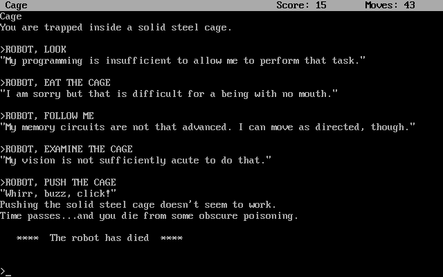 Today's "I never saw Zork II do that before" bug is...The JIGS-UP routine doesn't kill the player, it kills the current actor. That's a feature. But when a timer routine is run, it doesn't change the current actor back to the player.So simply by talking to the robot, I can save myself from death by timed event.I had hoped to use this on the Wizard, but apparently his action routine terminates too early. That too may be a bug, but one that cancels the first one.#Infocom