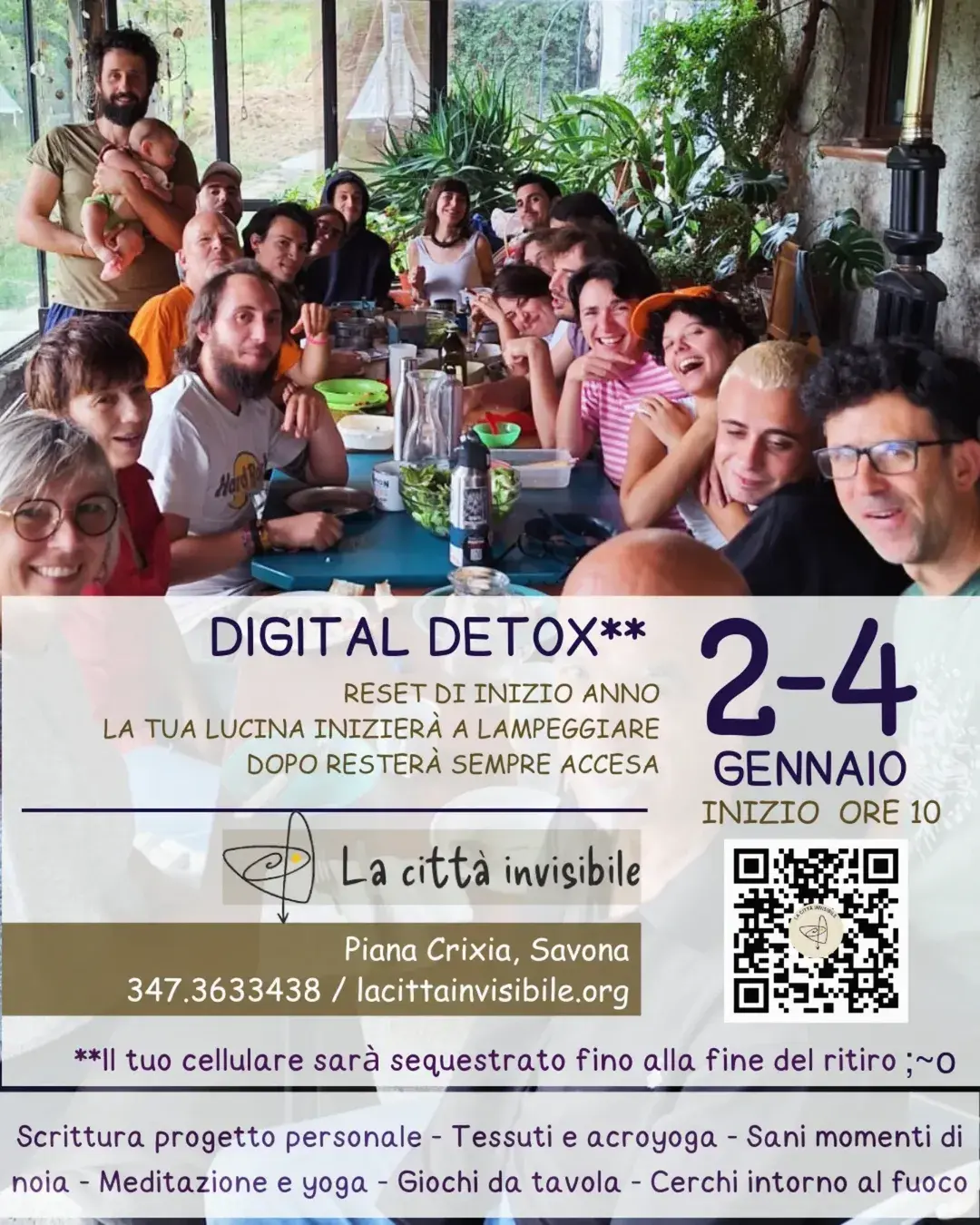 Arriva un nuovo anno, quale modo migliore di accoglierlo insieme? 🌟🌟🌟 Condividiamo desideri e progetti nella gioia di pasti condivisi, canti intorno al fuoco, tisane calde vicino alla stufa a legna. ☃️☃️ Ma anche classi di tessuti e acro-yoga! 🧘♂️ Stacca la spina per un nuovo inizio, per affrontare con più luce la nuova vita che ci attende. Senza cell è meglio 😉 Possibilità di raggiungerci a Capodanno. Info e prenotazioni:https://lacittainvisibile.org/digital-detox-iscriviti347 3633 438 Un abbraccio invisibile 🫥🫥