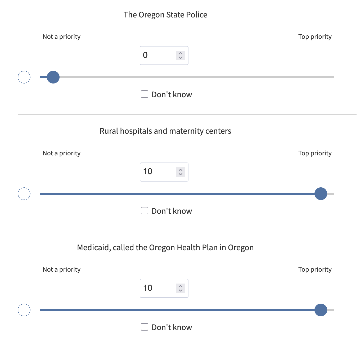 "Next is a list of programs the Oregon government funds. After each, please indicate how much of a priority it is to you that the Oregon government maintains funding for each of these programs on a scale of 0 to 10, where 0 means it is not a priority and 10 means it is a top priority."I'm doing my part!