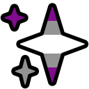 Simplified drawing of a white person smiling and making the peace sign with the right hand, wavy hair at the chin length, all to the left side, going from pink to warm orange, blue eyes, big rounded glasses, wearing a black long-neck sweater, purple background with yellow sparkles. Made using picrew by ALOHASUSHICORE.
